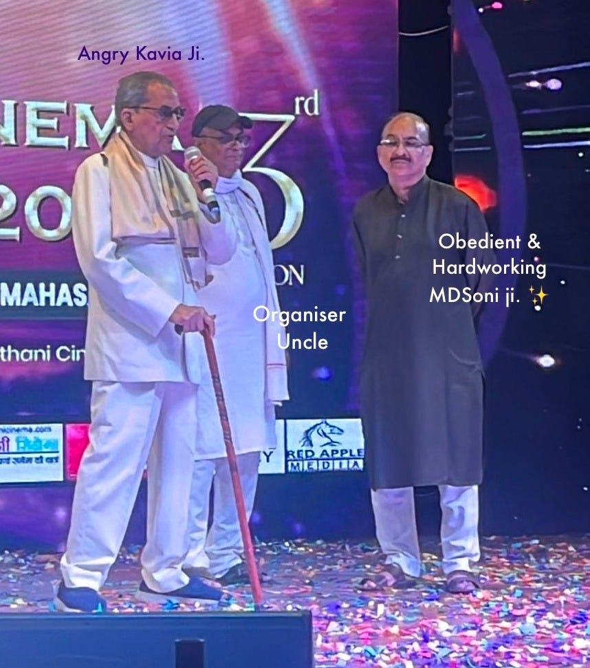 “We have to admit that Rajasthani industry is technically inferior - aesthetically substandard”- he roared on the mic. People who had gathered around him to get a photograph slyly dispersed - he spoke till the last end- till the lights were taken down and the sweepers came to collect trash. In his 15 minute monologue- he sang a song- told a folk tale - remembered a few names from Rajasthani film industry who were forgotten in the Three hour long award saga and blasted the audience for talking amongst themselves while he spoke “chup ho jaiye, nahi to bahar nikaliye” was how he began his speech.